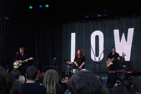 之后出场的Low让我惊喜了一把。很明显能看出Low的乐迷和澈心之痛的乐迷从年龄段和打扮上有着很大的差别。一群中年乐迷站到了最前头。一名绑着头巾老摇滚摸样大叔还好心地让站在我前面的记者朋友不要挡着我的镜头。这支在前几年加盟Sub Pop旗下的slowcore乐队成军于90年代初的明尼苏达。然而,Low的历史可以追溯到主音兼吉他手Alan Sparhawk 9岁的那一年,那是他第一次遇见鼓手Mimi Parker. 后来的Low便是这两个人的爱情结晶。